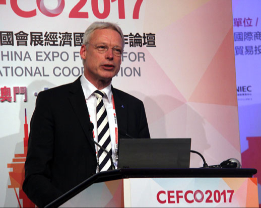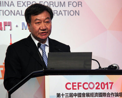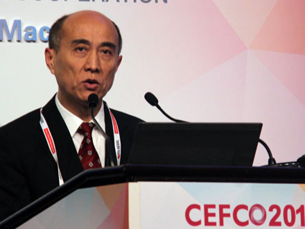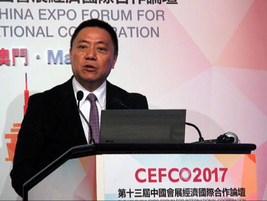 时任澳门会议展览业协会会长、南光(集团)有限公司常务董事总经理段洪兴在全体会议上发表演讲
